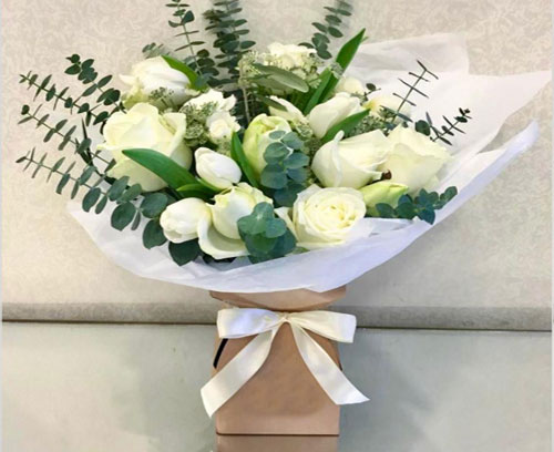 Buchet Trandafiri Alb, Lalele, Eucalipt.